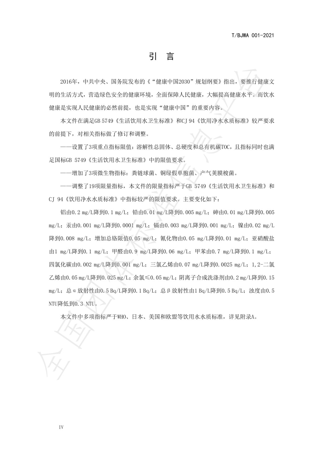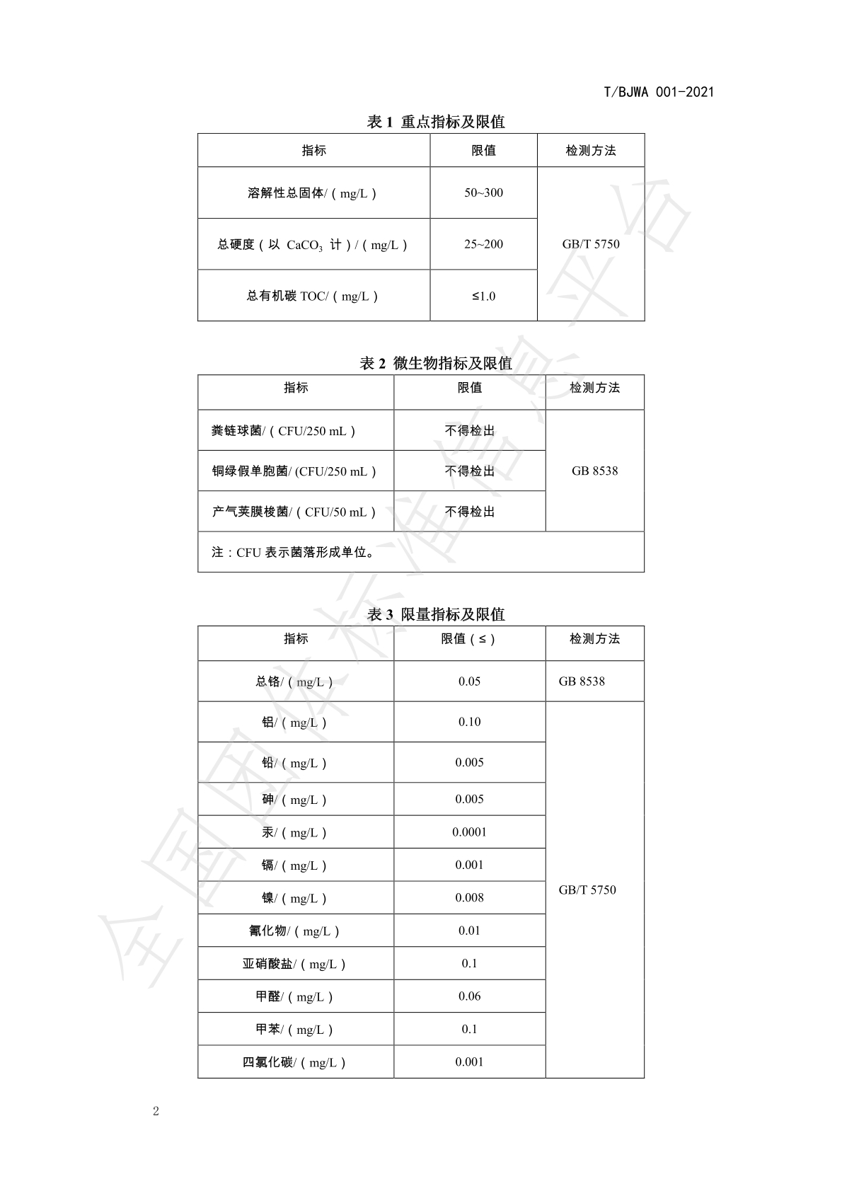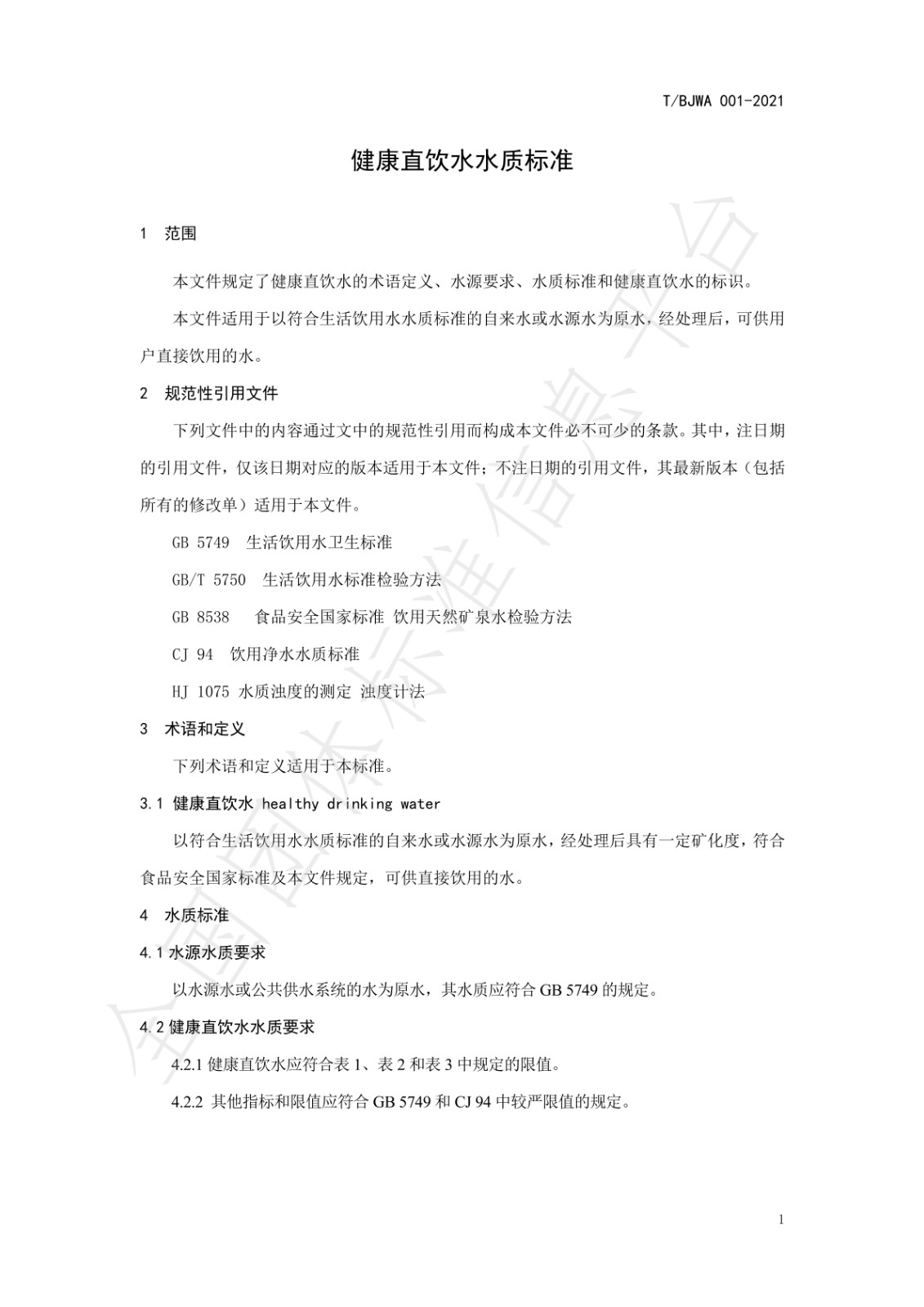 《健康直饮水水质标准》(T/BJWA 001-2021)