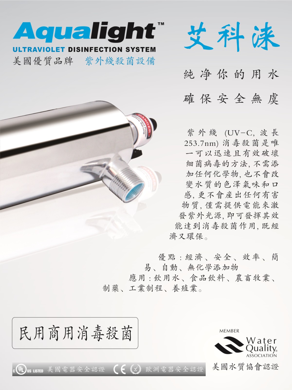 美国品牌Aqualight紫外杀菌系列产品被广泛地应用于家庭、商业和工业用途。通过代理商经销服务,Aqualight紫外杀菌系列产品遍及美国、 中南美洲、 亚洲 、中东 、欧洲。 美国优质品牌,值得您的信赖。作为一个积极关注健康保健的企业,我们致力于无化学的紫外线杀菌方法来净化水。我们的价值是提供的高质量的安装和维修服务和得到客户的支持。我们将通过为客户提供能够帮助他们增进生意和引领他们产业发展的创新产品和全方位服务。